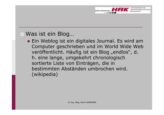 Ein Blog ist ein digitales Journal, das häufig in einer langen, umgekehrt chronologischen Liste von Einträgen veröffentlicht wird. Es gibt verschiedene Arten von Blogs, die nach Medien und Inhalten kategorisiert werden können, beispielsweise Fotoblogs und Bildungsblogs. Blogs sind nützliche Werkzeuge für kooperatives und selbstorganisiertes Lernen und können für Diskussionen, Dokumentationen und die Präsentation von Ergebnissen genutzt werden.