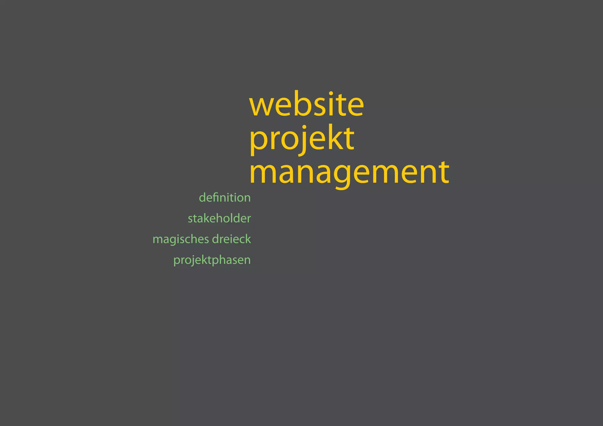 Das Dokument beschreibt die Grundlagen des Website-Projektmanagements, einschließlich der Definition von Projekten, Projektphasen und den unterschiedlichen Perspektiven der Stakeholder wie Unternehmensleitung, Projektleitung, Mitarbeiter und Kunden. Es betont die Bedeutung einer sorgfältigen Planung und Qualitätskontrolle, um die Zielvorgaben innerhalb des magischen Dreiecks von Zeit, Kosten und Qualität zu erreichen. Zudem werden die Schritte von der Ideenfindung bis zur Auswertung und Abschlussbesprechung im Projektprozess erläutert.
