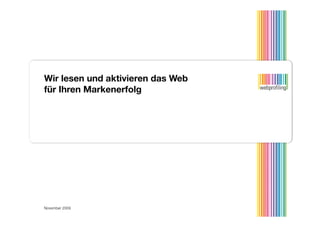 Der Dokument beschreibt die Bedeutung von Webprofiling für den Markenerfolg und die Wahrnehmung von Marken in der digitalen Welt. Es betont die Relevanz von nutzergenerierten Inhalten und die Notwendigkeit, Online-Meinungen systematisch zu erfassen und zu analysieren, um zukünftige Marketingstrategien zu optimieren. Zudem werden verschiedene Dienstleistungen im Bereich Internet-Monitoring, Insight-Profiling, Brand-Consulting und Crowd-Sourcing vorgestellt.