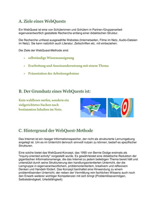 Das Dokument beschreibt das Konzept und die Methode von Webquests, einer strukturierten Form des Lernens, bei der Schüler selbstständig Informationen recherchieren und präsentieren. Es werden die Ziele, der Ablauf in sechs Phasen sowie die Erstellungsweise von Webquest-Dokumenten erklärt. Zusätzlich werden verschiedene Online-Ressourcen und Beispiele für die Umsetzung von Webquests bereitgestellt.