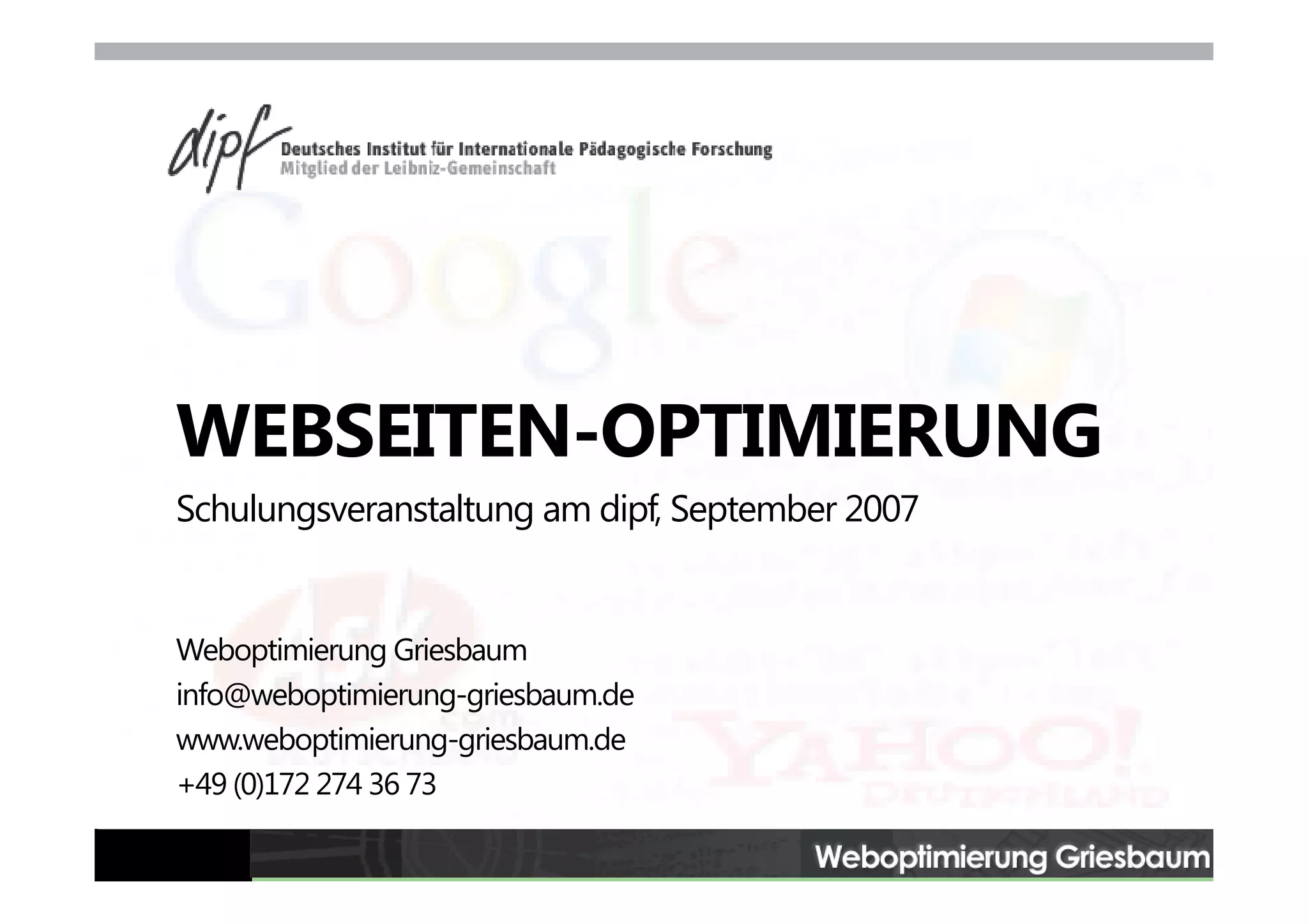 Das Dokument behandelt die Schulungsveranstaltung zur Webseiten-Optimierung, die von Weboptimierung Griesbaum im September 2007 angeboten wurde. Es erläutert die Grundlagen der Suchmaschinenoptimierung, Optimierungsmethoden sowie den Umgang mit unterschiedlichen Suchdiensten und betont die Bedeutung dieser Maßnahmen für den kommerziellen Erfolg von Webseiten. Des Weiteren werden verschiedene Rankingfaktoren und Techniken zur Steigerung der Sichtbarkeit in Suchmaschinen diskutiert.