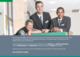 Das Dokument beschreibt die kaufmännische Software Webware 36, die für Handels-, Industrie- und E-Commerce-Unternehmen konzipiert ist und einen ganzheitlichen Beratungsansatz sowie ERP-Kompetenz betont. Es hebt die Notwendigkeit hervor, Unternehmen durch effektive Integration von ERP-Systemen und Webshops zu unterstützen, um den Herausforderungen des modernen Marktes gerecht zu werden. Webware bietet Funktionen zur Optimierung verschiedener Geschäftsprozesse, einschließlich Warenwirtschaft, Lagerverwaltung und Finanzbuchhaltung, sowie Schulungsprogramme zur Förderung der ERP-Kompetenz von Agenturen.