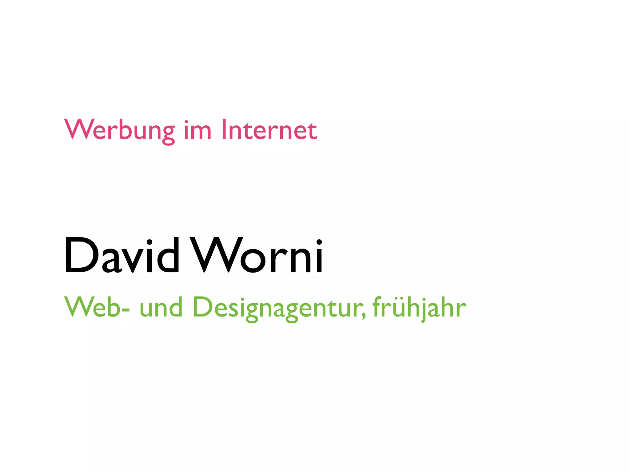 Das Dokument beschreibt verschiedene Ansätze zur Internetwerbung durch die Web- und Designagentur David Worni, einschließlich klassischer Werbung wie Mailings und Inserate sowie moderne Strategien wie Bannerwerbung und Social Media. Es hebt die Bedeutung der Kundenbindung, Neukundengewinnung und Feedback-Möglichkeiten hervor. Zudem werden verschiedene Werbeformen und Aktionen wie Gutscheine und Veranstaltungen zur Promotion von Produkten und Dienstleistungen vorgestellt.