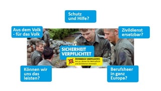 Die allgemeine Wehrpflicht wird als wichtiger Bestandteil der demokratischen Kontrolle in Österreich betrachtet, um die Gesellschaft in Fragen der Sicherheit und Verteidigung einzubeziehen. Der Verteidigungsminister Norbert Darabos betont die Notwendigkeit dieser Wehrpflicht und warnt vor den Kosten und Problemen eines Berufsheeres, das sich in anderen Ländern gezeigt hat. Es wird argumentiert, dass ein verpflichtender zivildienstrechtlicher Rahmen für die Gesellschaft bedeutend ist und der Verlust dieser Strukturen zu einem Mangel an freiwilligem Engagement führen könnte.