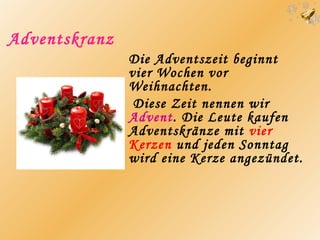 Die Adventszeit beginnt vier Wochen vor Weihnachten und umfasst Traditionen wie das Anzünden von Kerzen am Adventskranz und das Öffnen von Türchen im Adventskalender. Am Heiligen Abend werden das traditionelle Festessen, Geschenke und das Singen von Weihnachtsliedern gefeiert, während der Weihnachtsbaum geschmückt wird. Weihnachten ist besonders für Kinder ein bedeutendes Fest, das im Familienkreis mit verschiedenen Bräuchen und Symbolen wie dem Weihnachtsstern begangen wird.