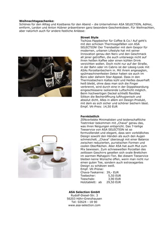Das Dokument präsentiert vielfältige Geschenkideen von verschiedenen Unternehmen, darunter moderne Thermosgefäße, elegante Teeservices und kreative Küchengeräte, die sowohl Funktionalität als auch ansprechendes Design bieten. Zusätzlich werden spezielle Produkte wie Cocktail- und Champagnerboxen sowie ein langlebiger Tischkalender vorgestellt, die für festliche Anlässe geeignet sind. Abschließend werden edler Schmuck und innovative Wohnsysteme erwähnt, die Stil und Kreativität für den Alltag verkörpern.