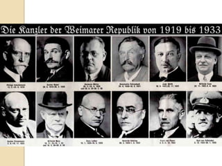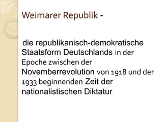 Die Weimarer Republik war die republikanisch-demokratische Staatsform Deutschlands von 1919 bis 1933, die nach der Novemberrevolution von 1918 entstand und die Auswirkungen des Versailler Vertrags erlebte, einschließlich territorialer Verluste und politischer Umwälzungen. Wichtige Ereignisse waren die erste Sitzung der Nationalversammlung in Weimar, die Gründung der NSDAP sowie inflationäre Krisen, die zur Ersetzung der Reichsmark führten. Die Weimarer Republik endete schließlich mit der Ernennung Hitlers zum Reichskanzler am 30. Januar 1933.