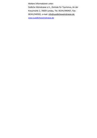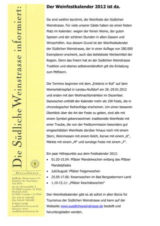 Der Weinfestkalender 2012 der südlichen Weinstraße listet über 100 Weinfeste, die aufgrund ihrer feinen Weine und guten Speisen zu den beliebtesten Veranstaltungen der Region gehören. Er startet mit dem 'Erlebnis in Rot' am 28.-29. Januar 2012 und endet mit den Weihnachtsmärkten im Dezember. Der Kalender ist in einer Auflage von 280.000 Exemplaren erhältlich und bietet eine gute Übersicht über die Feste, gekennzeichnet mit Symbolen für verschiedene Arten von Veranstaltungen.