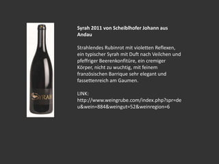 Das Dokument beschreibt verschiedene Weine von Scheiblhofer Johann aus Andau, darunter Syrah, Pinot Noir, Cuvee Big John Reserve und Cabernet Sauvignon. Jeder Wein wird mit spezifischen Geschmacksnoten, Aromen und texturalen Eigenschaften vorgestellt. Links zu weiteren Informationen sind ebenfalls enthalten.