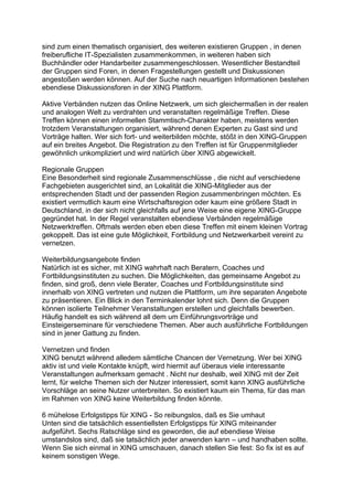 Xing ist ein bedeutendes berufliches Netzwerk, das Angestellten, Selbstständigen und Freelancern ermöglicht, sich zu vernetzen und fortzubilden, indem es über 55.000 Gruppen und zahlreiche Veranstaltungen bietet. Mitglieder können sich an Fachforen und Treffen beteiligen, um wertvolle Informationen auszutauschen und ihre beruflichen Fähigkeiten zu erweitern. Der Autor Robert Nabenhauer gibt praktische Tipps zur erfolgreichen Nutzung von Xing, darunter die Optimierung von Profilen, Teilnahme an Gruppen und das Initiieren von Kontaktaufnahmen.