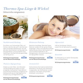Das Dokument informiert über die Buchung und Stornierung von Wellness-Behandlungen, empfiehlt frühzeitige Reservierungen und erläutert die Stornierungsrichtlinien. Es beschreibt verschiedene Angebote wie Massagen, Körperbehandlungen und kosmetische Anwendungen, die zur Entspannung und Hautpflege dienen. Zudem werden Informationen zur Nutzung der Wasserwelt und Saunalandschaft bereitgestellt sowie spezielle Hinweise zu gesundheitlichen Einschränkungen der Gäste.