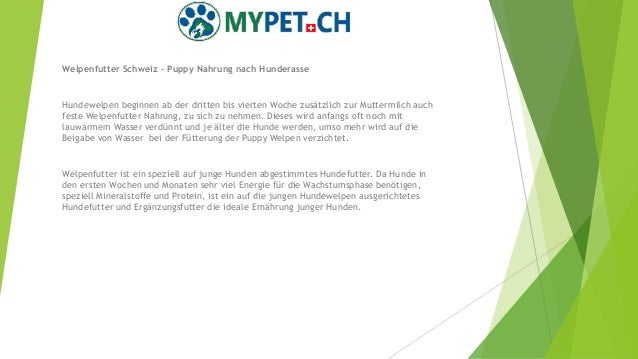 Das Dokument beschreibt Welpenfutter für Hunde bis zu 12 Monaten in der Schweiz, das sowohl in Trocken- als auch in Nassfutterform erhältlich ist. Es betont die Bedeutung einer speziell auf die Bedürfnisse junger Hunde abgestimmten Ernährung, die reich an Mineralstoffen und Proteinen ist, um das Wachstum zu unterstützen. Zudem werden verschiedene Marken und Produkte vorgestellt, die für Welpen geeignet sind.