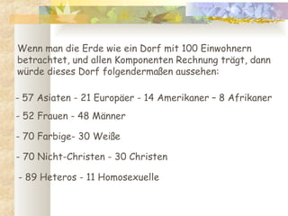 Die Betrachtung der Erde als ein Dorf mit 100 Einwohnern zeigt extreme Ungleichheiten in Bezug auf Nationalität, Geschlecht, Glauben und Wohlstand. Nur wenige Menschen besitzen den Großteil des Reichtums, während viele in Armut leben, unter Krieg und Hunger leiden. Der Text fordert zu mehr Verständnis und Toleranz auf und betont, wie wichtig es ist, die eigenen privilegierten Lebensumstände zu erkennen und Freundschaft zu fördern.