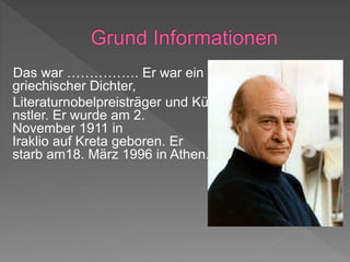 Odysseas Elytis war ein griechischer Dichter, Nobelpreisträger und Künstler, geboren am 2. November 1911 in Iraklio, Kreta, und gestorben am 18. März 1996 in Athen. Er veröffentlichte zahlreiche Werke, darunter Gedichte, Essays und Übersetzungen, und reiste in viele Länder, darunter die Schweiz, Paris und die USA. Elytis ist bekannt für seine literarischen Beiträge, die die griechische Kultur und Identität reflektieren.