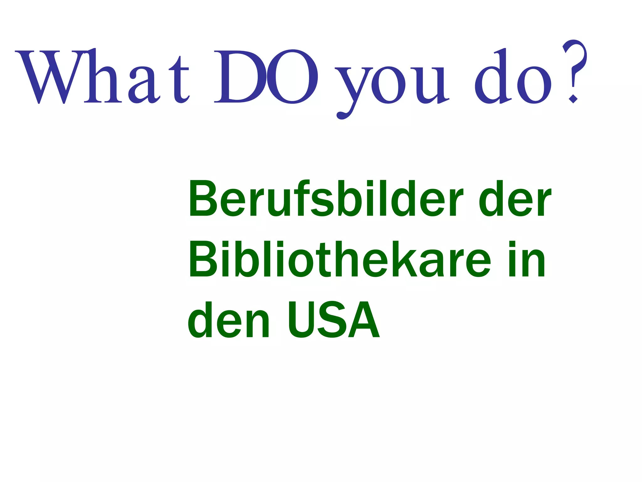 Das Dokument beschreibt die verschiedenen Berufsbilder von Bibliothekaren in den USA und hebt die Vielfalt der Rollen hervor, einschließlich Referenz-, System- und Metadata Librarians. Bibliothekare benötigen in der Regel einen Master of Library Science und sind oft Generalisten, während spezialisierte Rollen wie in den technischen oder besonderen Sammlungsdiensten eher selten sind. Es wird auch betont, dass IT-Kenntnisse zunehmend wichtiger werden, um den sich wandelnden Anforderungen der Institutionen gerecht zu werden.