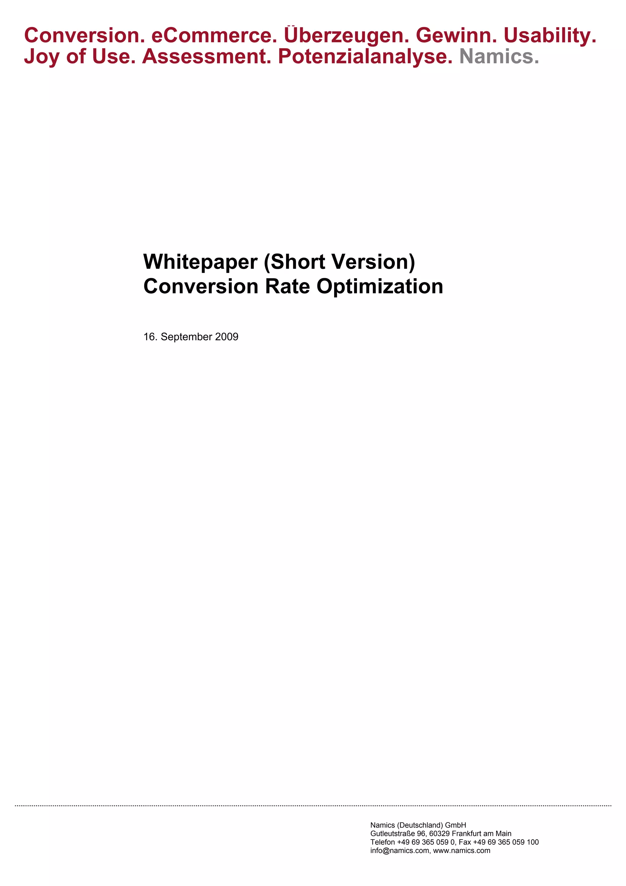 Das Whitepaper von Namics beschäftigt sich mit der Conversion Rate Optimization (CRO), definiert grundlegende Begriffe und beschreibt wesentliche Einflussfaktoren auf die Konversionsrate, wie Emotionen, Usability, und direkte Ansprache der Nutzer. Es hebt das Potenzial zur Verbesserung der Konversionsraten in Deutschland hervor und bietet eine Potenzialanalyse sowie konkrete Handlungsempfehlungen, um die Performance von Websites zu steigern. Abschließend wird betont, dass CRO ein kontinuierlicher Prozess ist, der für Unternehmen unerlässlich ist, um im Online-Wettbewerb erfolgreich zu bleiben.