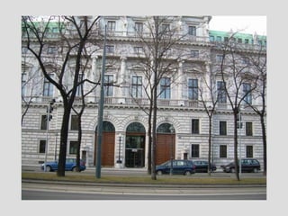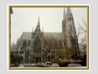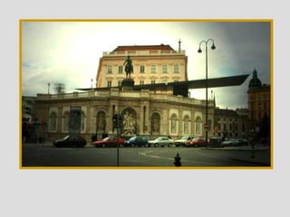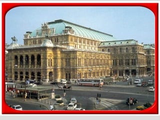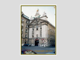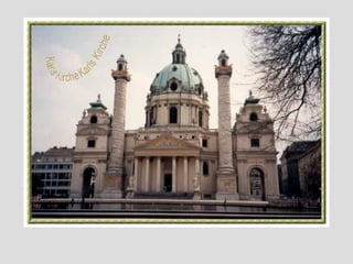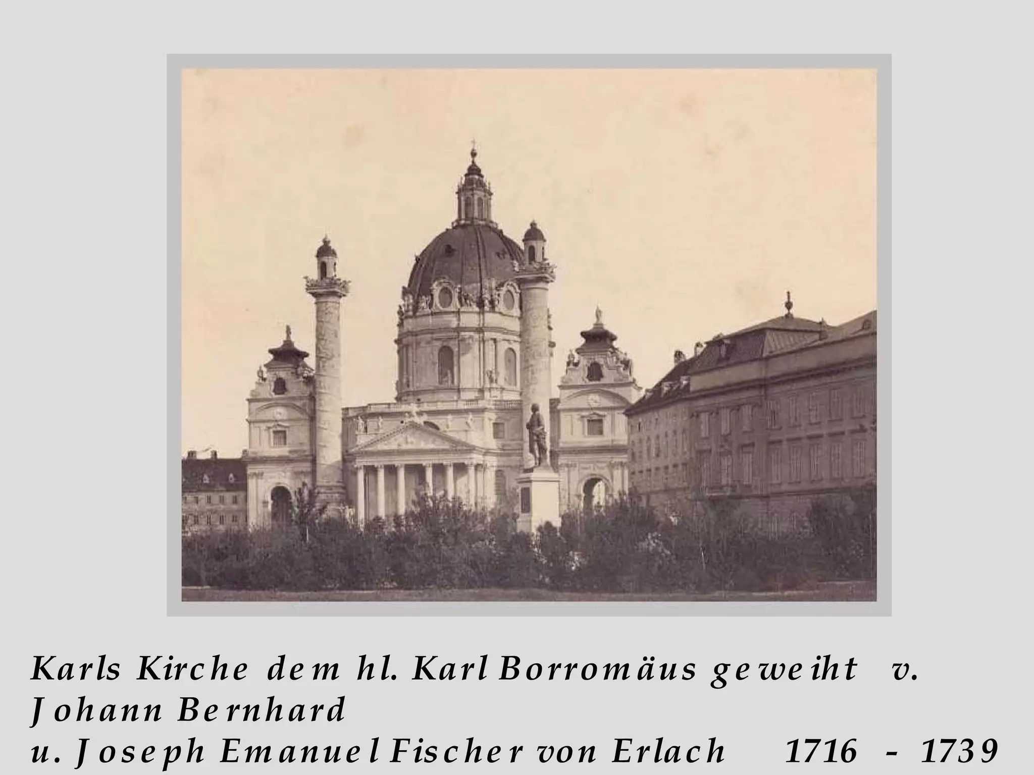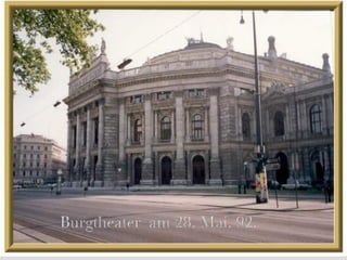 Das Dokument beschreibt verschiedene Gebäude und historische Stätten in Wien, darunter die Karls Kirche, den Franz-Josefs-Brunnen und das Burgtheater, sowie deren Baujahre und historische Ereignisse. Es werden zahlreiche Umbenennungen, Abrisse und Zerstörungen während der Kriege erwähnt, einschließlich der Zerstörung von Gebäuden wie dem Opernhaus und dem Sühnhaus. Zudem wird auf die Wiederaufbau- und Gedächtnisprojekte eingegangen, die an diese historischen Stätten erinnern.