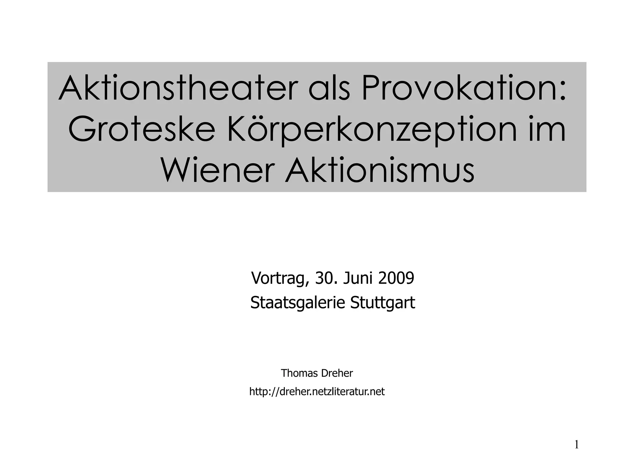 Der Vortrag vom 30. Juni 2009 befasst sich mit dem Wiener Aktionismus und der Aktionsmalerei, insbesondere den kreativen und provokanten Ansätzen von Künstlern wie Hermann Nitsch, Günter Brus und Rudolf Schwarzkogler. Diese Kunstbewegung thematisiert die Beziehung zwischen Körper, Aggression und sozialen Praktiken in Performances und Gemälden, die oft blasphemisch und provokant sind. Es werden verschiedene Aktionsformen und ihre historische Bedeutung in der modernen Kunst detailliert dargestellt.
