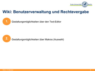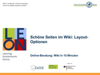 Das Dokument bietet eine Übersicht über die Nutzung von Wikis, insbesondere dessen Layout-Optionen und Benutzerverwaltung. Es beschreibt verschiedene Gestaltungsmöglichkeiten über den Text-Editor sowie Makros, wie das 'Panel'- und 'Erweitern'-Makro. Weitere Informationen sind im CEDIS-Schulungswiki zu finden.