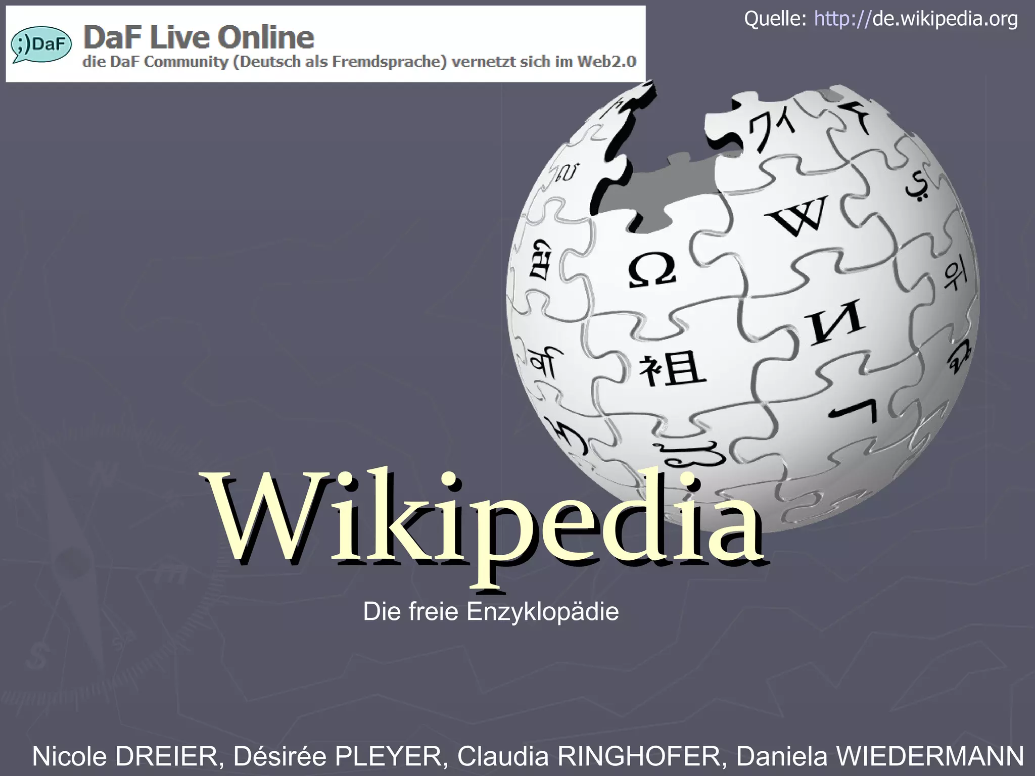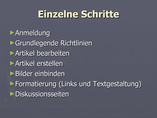 Das Dokument bietet eine umfassende Anleitung zur Bearbeitung und Erstellung von Artikeln auf Wikipedia. Es enthält detaillierte Schritte zur Anmeldung, zum Schreiben nach grundlegenden Richtlinien sowie Informationen zur Einbindung von Bildern und zur Nutzung von Diskussionsseiten. Zusätzlich werden Möglichkeiten zur Kontaktaufnahme mit der DAF-Community aufgezeigt.