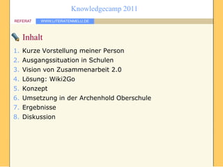 Das Referat von Melanie unbekannt beim KnowledgeCamp 2011 thematisiert eine Verbesserung der Lehrmethoden in Schulen durch die Einführung von kollaborativen Ansätzen wie 'wiki2go'. Es wird ein Wandel der Lehrerrolle zum Moderator angestrebt, um Schüler zur eigenständigen Wissensaneignung zu animieren und nachhaltige Lernformen zu fördern. Erste Umsetzungen an der Archenhold Oberschule zeigen positive Evaluationsergebnisse hinsichtlich der Nutzung des Schulwikis für die Vorbereitung auf Klassenarbeiten und die Durchführung von Projekten.