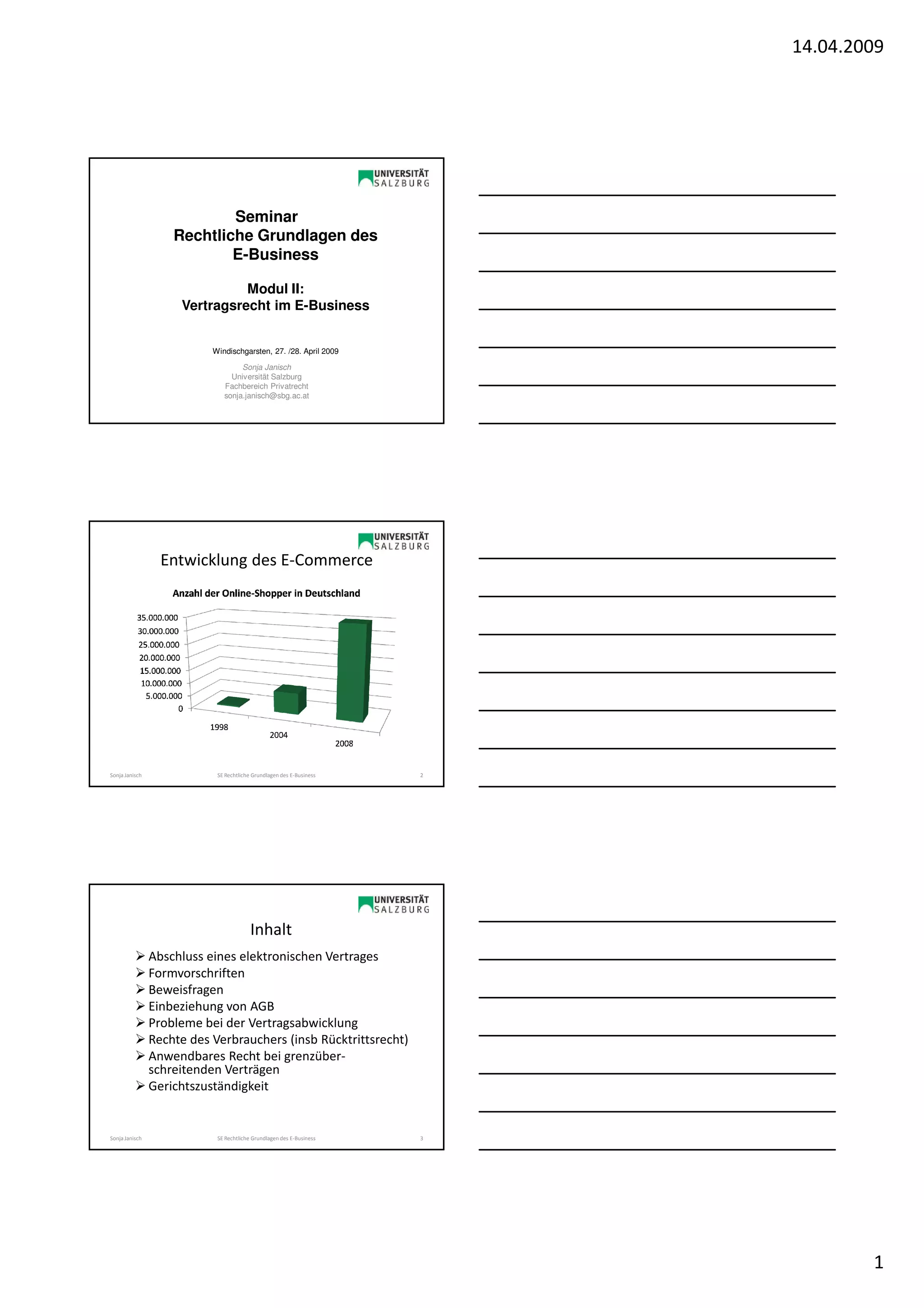Das Dokument behandelt die rechtlichen Grundlagen des E-Business, insbesondere das Vertragsrecht im E-Commerce, und erläutert Themen wie den Abschluss elektronischer Verträge, formale Anforderungen, Beweisfragen, Einbeziehung von Allgemeinen Geschäftsbedingungen (AGB) sowie Verbraucherrechte. Es werden die anwendbaren Gesetze, die Rechte der Verbraucher, insbesondere das Rücktrittsrecht sowie relevante internationale Regelungen zur Zuständigkeit und zum anwendbaren Recht behandelt. Zudem werden die Probleme der Vertragsabwicklung und die Besonderheiten bei grenzüberschreitenden Verträgen thematisiert.
