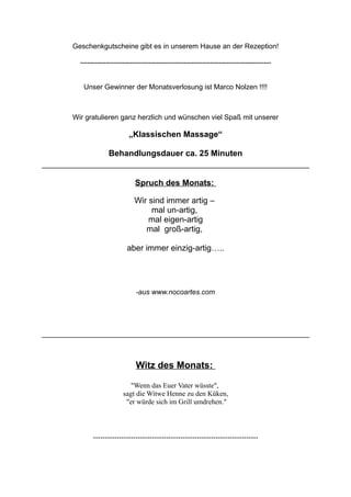 Das Rückenzentrum Hückeswagen bietet im Juni 2013 Trainingssteuerungsseminare sowie ein Monatsangebot für Aromaöl-Massagen an. Zudem wurde Marco Nolzen als Gewinner der Monatsverlosung bekannt gegeben, und das Zentrum lädt zur Teilnahme an Rehasport-Angeboten ein. Für Fragen steht das Team täglich persönlich zur Verfügung.