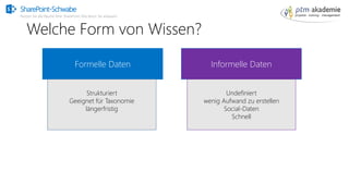Das Dokument behandelt das Wissensmanagement in SharePoint und wie Nutzer alle Funktionen ihrer 'SharePoint-Villa' effektiv nutzen können, bevor sie zusätzliche Ressourcen hinzufügen. Es werden verschiedene Formen von Wissen, geeignete Funktionen sowie Trainingsmöglichkeiten für unterschiedliche Zielgruppen vorgestellt. Zudem wird die Wichtigkeit der Suchfunktionalität und der Zugriffsmöglichkeiten betont.