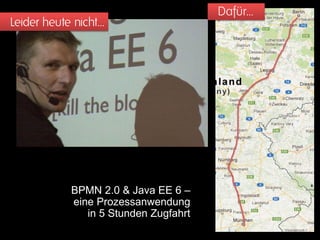 Das Dokument beschreibt die Implementierung einer Prozessanwendung mit BPMN 2.0 und Java EE 6, die innerhalb von fünf Stunden entwickelt werden kann. Es wird ein typischer Anwendungsfall diskutiert, bei dem Prozessautomatisierung notwendig ist, um Bestellungen zu bearbeiten und Kunden zu informieren, wenn Waren nicht verfügbar sind. Darüber hinaus werden verschiedene technische Aspekte, wie der Einsatz von CDI, EJB und einer Prozess-Engine, sowie die Unterstützung durch Camunda Services GmbH thematisiert.