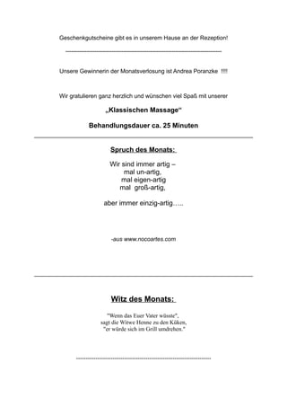 Das Rückenzentrum Hückeswagen bietet im Juni 2013 Trainingssteuerungsseminare an und informiert über ganzheitliches Training. Außerdem gibt es ein Monatsspecial für Aromaöl-Massagen mit reduzierten Preisen sowie eine Gewinnerin der Monatsverlosung. Kunden können bei Fragen täglich Unterstützung erhalten und es wird ein positiver Umgangston zur Förderung des Wohlbefindens vermittelt.