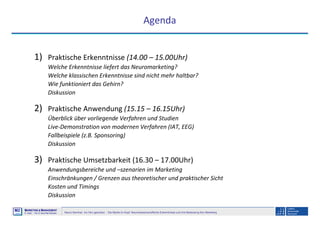 Das Neuro-Seminar 'Ins Hirn geschaut - die Marke im Kopf' von Prof. Dr. Klaus-Peter Wiedmann beschäftigt sich mit den Einsichten des Neuromarketings und der Bedeutung neurowissenschaftlicher Erkenntnisse für das Marketing. Themen umfassen die Funktionsweise des Gehirns, praktische Neuromarketing-Methoden sowie deren Anwendbarkeit in der Marketingpraxis. Die Forschung zeigt, dass emotionale und kognitive Prozesse eng miteinander verknüpft sind und dass die Verarbeitung von Marken auf neuronaler Ebene geschieht.