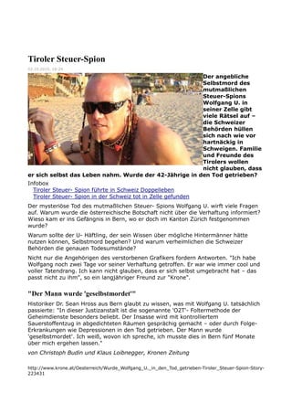 Der 42-jährige Tiroler Wolfgang U. wurde tot in seiner Gefängniszelle in der Schweiz aufgefunden, nachdem er wegen des Verkaufs sensibler Kundendaten einer Bank an die deutsche Finanzbehörde festgenommen worden war. Trotz offizieller Darstellung eines Selbstmords zweifeln Familie und Freunde an dieser Version und vermuten, dass er möglicherweise gezwungen wurde, zu sterben. Die schweizerischen Behörden und die Polizei geben nur spärliche Informationen zu den genauen Umständen seiner Festnahme und seines Todes preis.