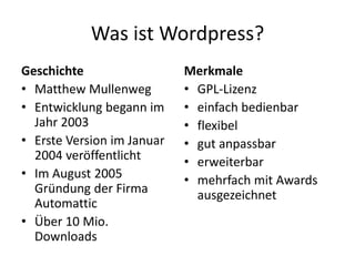Das Dokument behandelt die Grundlagen und den Einsatz von WordPress, einschließlich seiner Geschichte, Merkmale und Anforderungen für die Installation. Es werden wichtige Begriffe erklärt, die Funktionen von Plugins und Themes beschrieben sowie häufig verwendete Plugins aufgeführt. Zudem enthält es Links zu relevanten Ressourcen und Dokumentationen für die Nutzung von WordPress sowohl in englischer als auch in deutscher Sprache.