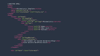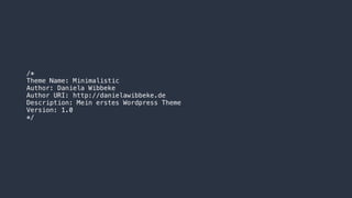 Das Dokument bietet eine Anleitung zur Erstellung eines eigenen WordPress-Themes, einschließlich der Vorteile, der benötigten Voraussetzungen und der einzelnen Schritte zur Theme-Entwicklung. Es beschreibt die Struktur und die wichtigsten Dateien wie header.php, index.php und footer.php sowie die Verwendung von Funktionen und Custom Fields. Am Ende wird auf ein Beispiel-Theme verwiesen, das als Referenz dienen kann.