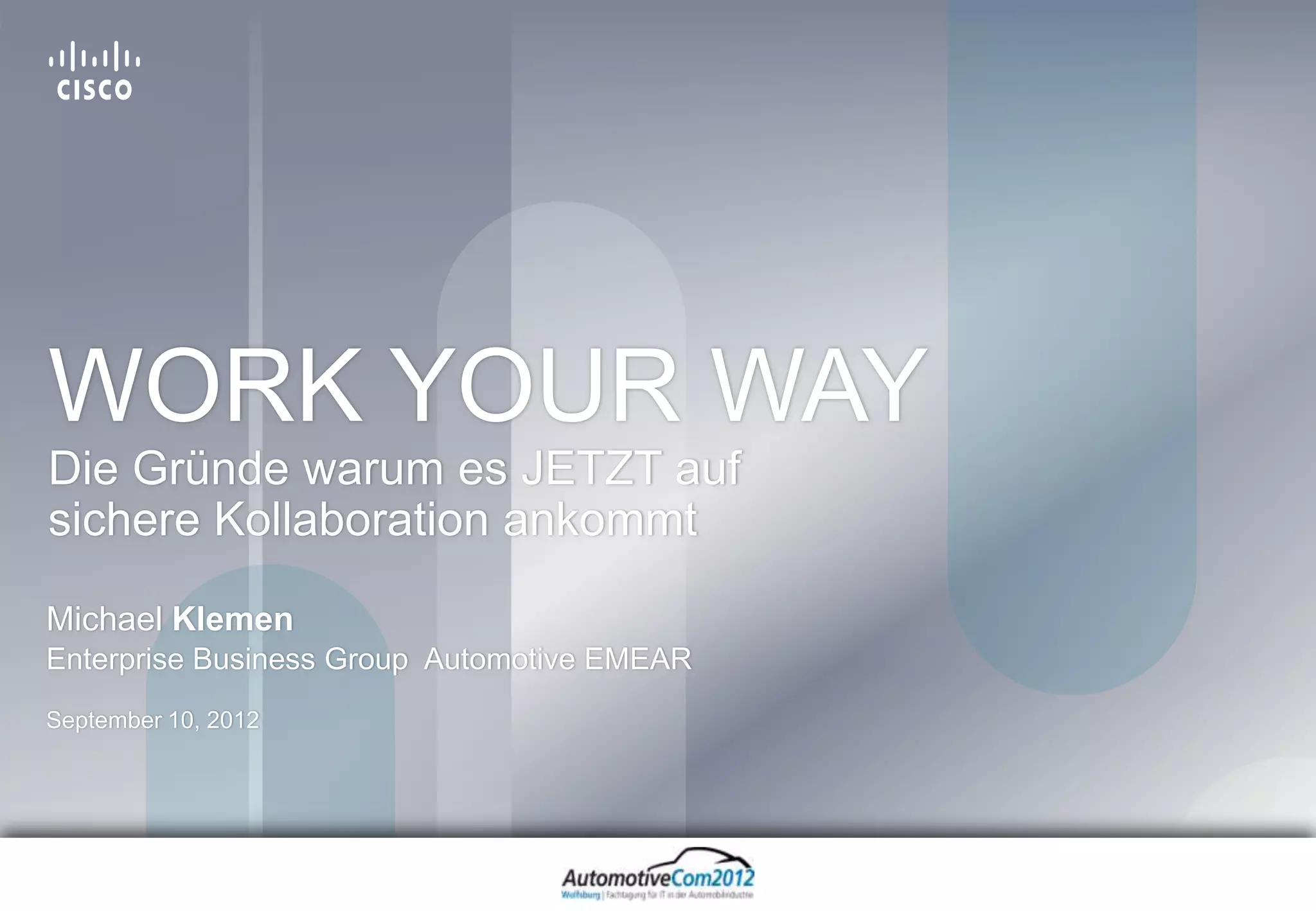 Das Dokument behandelt die Veränderungen in der Arbeitsweise durch sichere Zusammenarbeit und die Rolle der Cloud-Technologie. Es beschreibt, wie Flexibilität, Produktivität und der zukünftige Arbeitsplatz davon abhängen, wo und wie Mitarbeiter arbeiten. Zudem wird das intelligente Netzwerk hervorgehoben, das eine unabhängige und sichere Arbeitsumgebung ermöglicht.