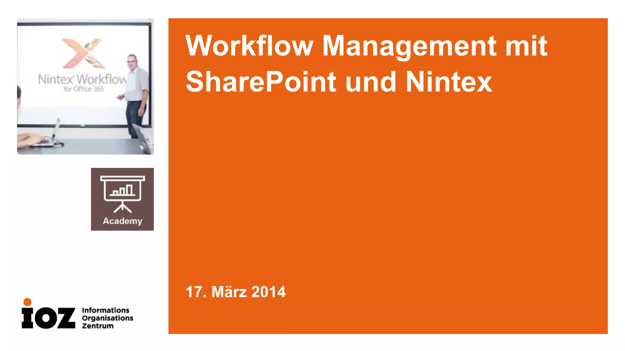 Das Dokument behandelt das Workflowmanagement mit SharePoint und Nintex, einschließlich der Hauptkomponenten und organisatorischen Besonderheiten. Es beschreibt die Definition des Umfangs von Workflows in HR- und IT-Prozessen sowie typische Elemente einer Lösung wie Aufgabenworkflows und Formulare. Zudem wird auf Schulungsangebote für Nintex eingegangen und auf wichtige Aspekte wie Testing und Wartung verwiesen.