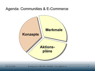 Das Dokument behandelt das Konzept des Social Commerce im E-Commerce, das die aktive Teilnahme und Interaktion von Kunden in Online-Communities betont. Es beschreibt verschiedene Beispiele für Social Commerce, die Herausforderungen bei der Nutzung und Entwicklung von Communitys sowie Strategien zur Steigerung der Kundenintegration und Vernetzung. Zudem werden rechtliche Aspekte und Probleme wie Free-Riding und Service-Qualität angesprochen.