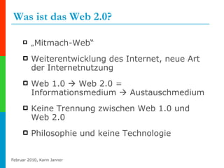 Das Dokument behandelt die Kernkonzepte und Anwendungen von Web 2.0 in Kulturinstitutionen, einschließlich der Bedeutung von Interaktivität, Partizipation und der kollaborativen Generierung von Inhalten. Es erklärt den Wandel in der Kommunikation durch neue Medien und betont die Notwendigkeit von Authentizität, Transparenz und echtem Dialog mit der Zielgruppe. Zudem werden praktische Schritte vorgestellt, um Web 2.0-Technologien erfolgreich zu implementieren, einschließlich der Nutzung von Blogs und Social Media zur Wissensvermittlung und Öffentlichkeitsarbeit.