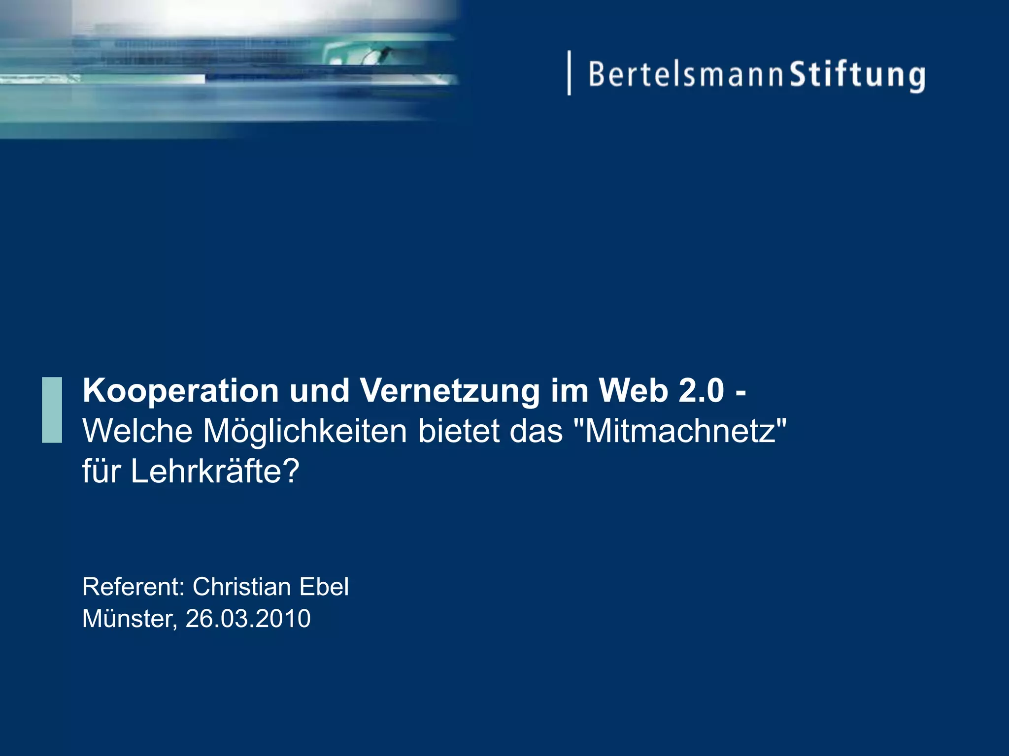 Der Workshop von Christian Ebel thematisiert die Möglichkeiten des Web 2.0 für Lehrkräfte und betont die Notwendigkeit individueller Förderung sowie kooperativen Lernens im Unterricht. Es wird aufgezeigt, dass viele Lehrkräfte die konstruktivistische Lehransatz bevorzugen, jedoch in der praktischen Umsetzung Unterstützung benötigen, insbesondere durch Erfahrungsaustausch und Fortbildungsangebote. Neue Kommunikationswege im Internet fördern die Vernetzung von Lehrkräften und den Austausch über innovative Lehrmethoden.