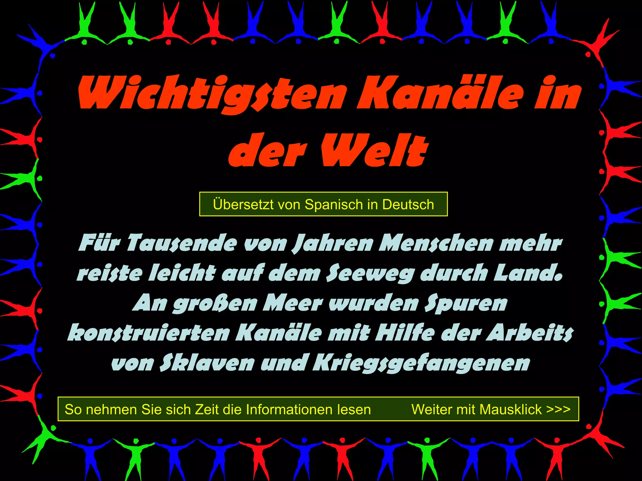 Das Dokument listet die wichtigsten künstlichen Kanäle der Welt auf, wie den Kanal von Korinth, den Suezkanal und den Panama-Kanal, und beschreibt deren Geschichte, Bau und Bedeutung. Es werden bedeutende Daten, wie die Anzahl der beteiligten Arbeiter und die Herausforderungen, denen sich die Bauprojekte gegenübersahen, hervorgehoben. Weitere erwähnte Kanäle sind der Nord-Ostsee-Kanal, der St.-Lorenz-Strom und der Kaiserkanal in China, der als ältester und längster Kanal der Welt gilt.