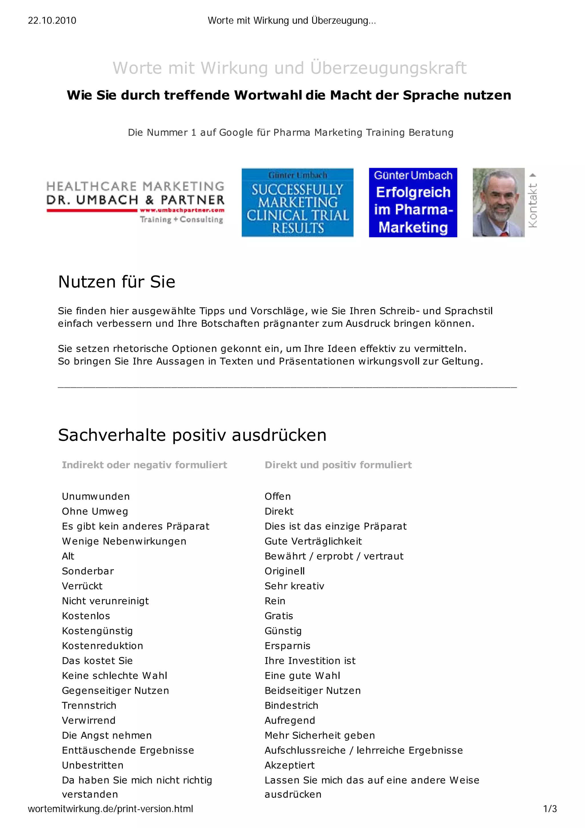 Das Dokument bietet Tipps zur Verbesserung des Schreib- und Sprachstils, um die Wirkung von Aussagen zu erhöhen und Botschaften prägnanter zu vermitteln. Es enthält Beispiele für positive Formulierungen, rhetorische Optionen und strategische Fragen, die helfen, Sachverhalte transparent und einladend zu kommunizieren. Die Empfehlungen stammen von Dr. med. Günter Umbach, einem erfahrenen Berater im Pharma-Marketing.
