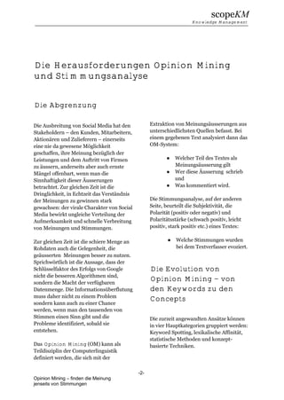 Das Dokument behandelt Opinion Mining, einen Bereich der Computerlinguistik, der sich mit der Analyse und Extraktion von Meinungsäußerungen aus Texten befasst, insbesondere in sozialen Medien. Es werden unterschiedliche Ansätze zur Stimmungsanalyse beschrieben, von einfachem Keyword Spotting bis hin zu komplexeren konzeptbasierten Techniken, die dazu dienen, die Nuancen von Meinungen und Emotionen zu erfassen. Zudem wird die Opinion Mining Skill Cartridge™ vorgestellt, ein integriertes System, das bewertende Ausdrücke identifiziert und analysiert, um wertvolle Einsichten aus großen Datenmengen zu gewinnen.