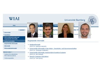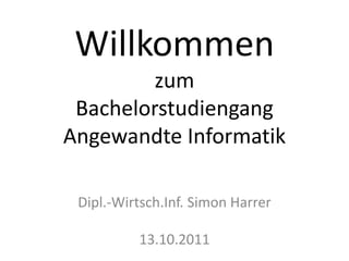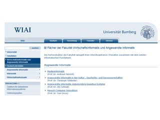 Das Dokument beschreibt den Bachelorstudiengang Angewandte Informatik an der Universität Bamberg, der insgesamt 210 ECTS umfasst und in 7 bis maximal 9 Semestern absolviert werden kann. Es werden verschiedene Modulgruppen, Pflicht- und Wahlpflichtmodule sowie die Prüfungsleistungen aufgeführt, die Studierende im Rahmen ihres Studiums zu absolvieren haben. Darüber hinaus enthält das Dokument Informationen zu den Anmeldeterminen für Prüfungen und zur Bachelorarbeit.