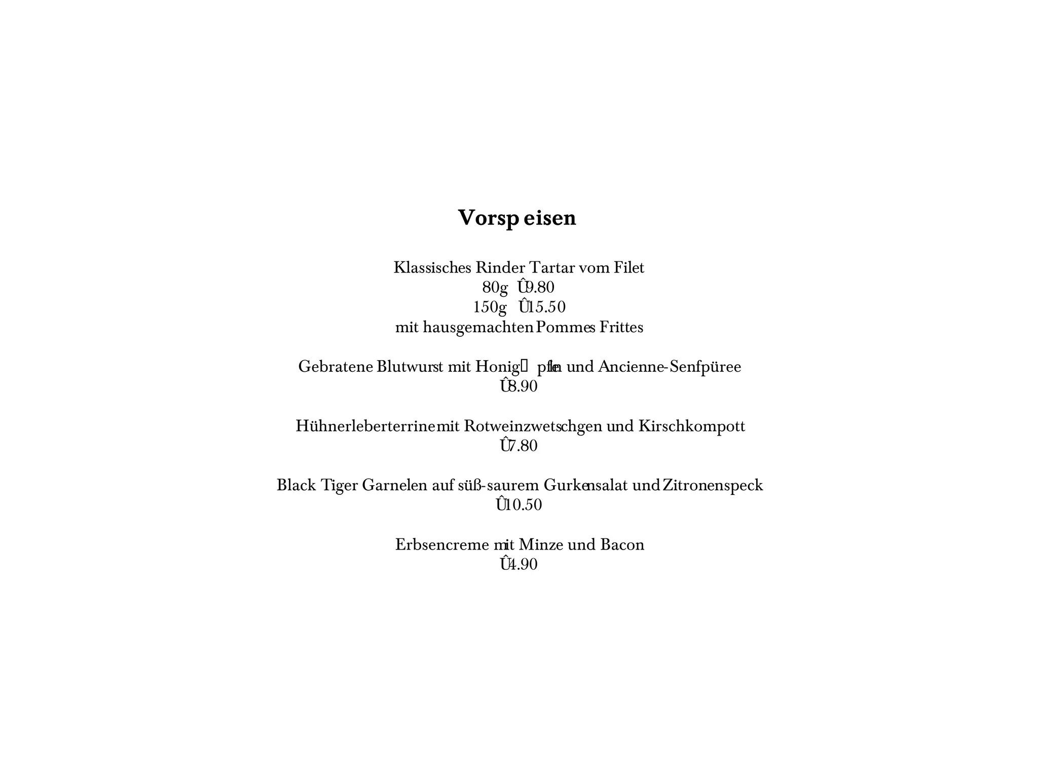 Das Dokument enthält ein vielfältiges gastronomisches Angebot mit einer Auswahl an Vorspeisen und Hauptspeisen, darunter Rindertartar, Garnelen und verschiedene Steakvarianten. Alle Gerichte werden mit hausgemachten Pommes frites und Sauce Béarnaise serviert, und es gibt auch eine Auswahl an Beilagen und Desserts. Darüber hinaus werden verschiedene Käsesorten angeboten, einschließlich regionaler Spezialitäten.