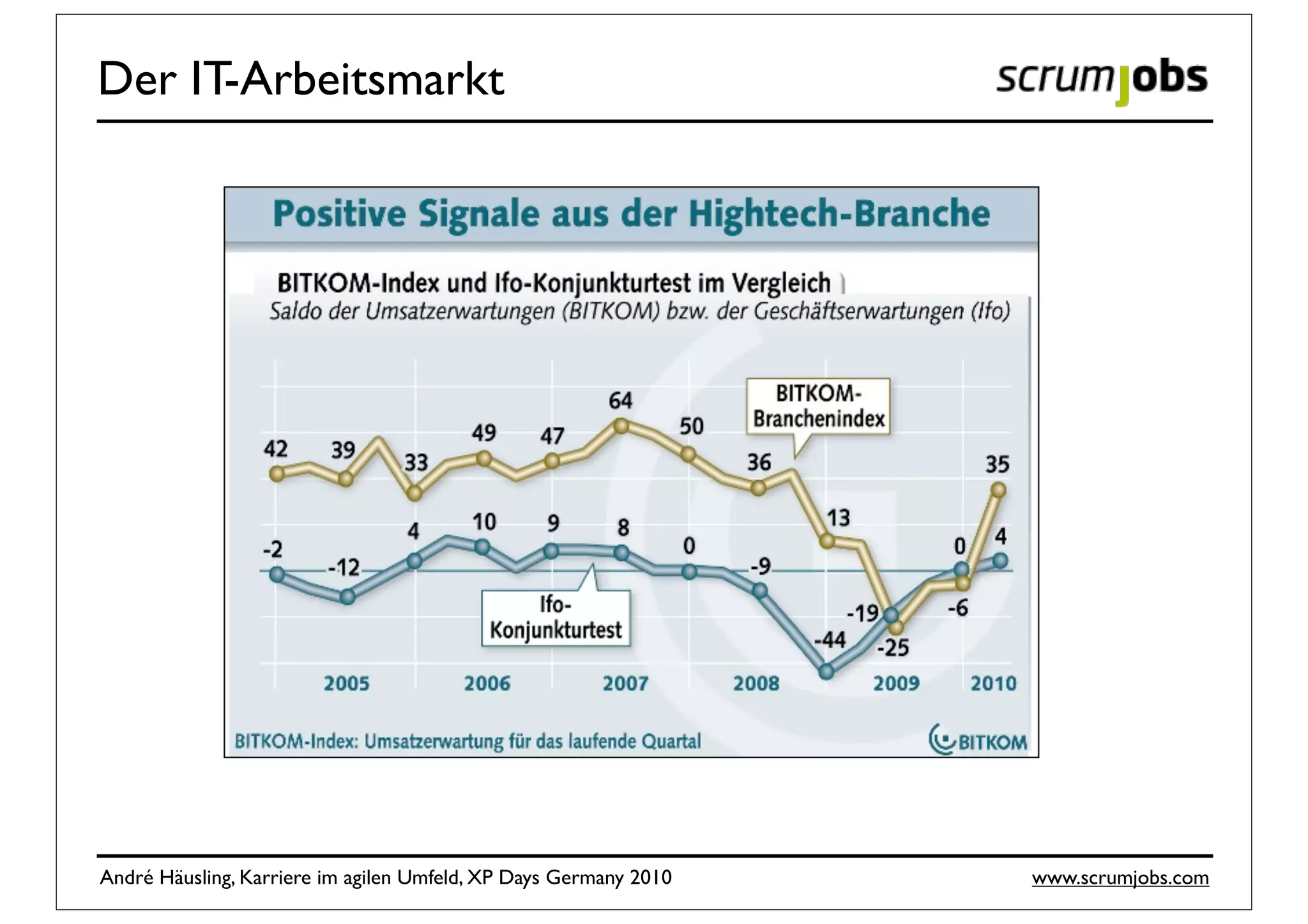 Das Dokument bietet einen Überblick über den IT-Arbeitsmarkt mit Fokus auf agile Methoden und die Nachfrage nach IT-Spezialisten, insbesondere in der Softwareentwicklung. Es werden Einstiegsmöglichkeiten und Tipps zur Karriere im agilen Umfeld gegeben, einschließlich der Nutzung von Jobbörsen und der Strukturierung von Bewerbungen. Zusätzlich werden Faktoren für Gehaltsbestimmungen sowie Karrierewege innerhalb der agilen Rollen skizziert.