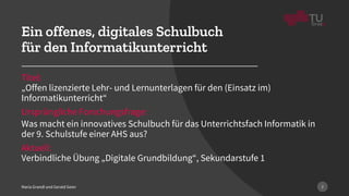 Das Dokument beschreibt die Entwicklung eines offenen, digitalen Schulbuchs für den Informatikunterricht in der 9. Schulstufe und lädt zur Mitwirkung ein. Es umfasst Themen wie digitale Grundbildung und Computational Thinking und nutzt Citizen Science-Methoden zur Erstellung von Lehrmaterialien. Interessierte können sich an die Autoren wenden, um Teil des Projekts zu werden.