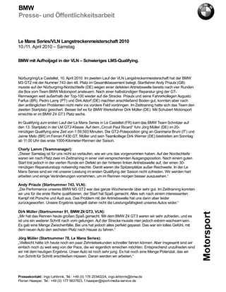 BMW hatte ein schwieriges Wochenende beim zweiten Lauf der VLN Langstreckenmeisterschaft, wo der BMW M3 GT2 aufgrund eines Antriebswellendefekts nach nur vier Runden aufgeben musste und den 48. Platz belegte. Im Qualifying zur Le Mans Series sicherte sich das Team Schnitzer lediglich den 13. Platz in der LM GT2-Klasse, während Dirk Müller im BMW Z4 GT3 den sechsten Platz erreichte. Teammanager Charly Lamm kündigte Verbesserungen an, um in den kommenden Rennen besser abzuschneiden.