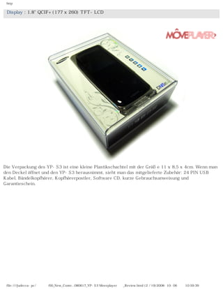 Der Bericht beschreibt den Samsung Yepp YP-S3, ein neues MP3-Gerät, das 2008 eingeführt wurde und durch ein erhöhtes Design sowie erweiterte Funktionen im Vergleich zum Vorgänger YP-K3 auffällt. Der YP-S3 verfügt über einen 1,8-Zoll-Bildschirm, ausreichende Speicheroptionen sowie beeindruckende Audio- und Videoqualität, und bietet eine Vielzahl von Benutzeroberflächen-Optionen und Einstellungen für Musik- und Videowiedergaben. Das Gerät ist in fünf Farben erhältlich und bietet zusätzliche Funktionen wie FM-Radio, Spiele und eine benutzerfreundliche Schnittstelle.