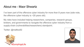 The document discusses the evolution and current state of the offensive cybersecurity industry, highlighting the challenges faced in recent years, including regulatory pressures, financial instability, and the rise of new entities like clearing houses. It outlines how end-to-end companies must choose between working with western or non-western clients, with implications for their operations, revenue, and market dynamics. Additionally, the document emphasizes the increasing difficulty in finding vulnerabilities and maintaining a stable supply chain due to these changes.