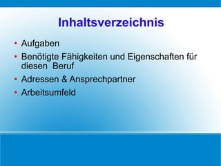 Die Präsentation beschreibt den Praxistag in der Zivildienststelle Großbeeren, wo die Hauptaufgaben das Ausfahren von Essen sowie kleinere Arbeiten wie Schneeschaufeln und Saubermachen sind. Für diese Beschäftigung sind ein Führerschein und etwas körperliche Kraft erforderlich, wobei keine spezifische Ausbildung notwendig ist. Ansprechpartner ist Günter Pächnatz vom Anglerverein Großbeeren 1932 e.V.